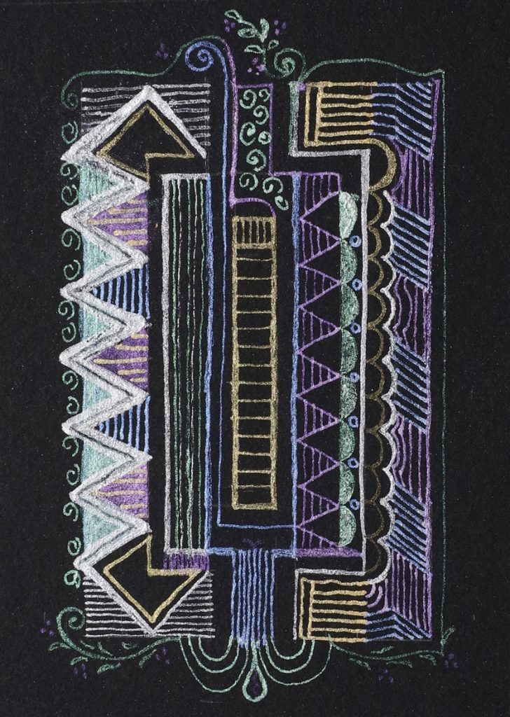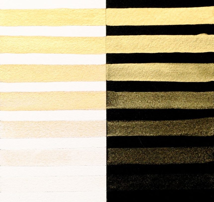 Iridescent paints create beautiful, slightly reflective surfaces when painted out transparently (Image 3). When used opaquely, they can provide a solid reflective surface with the appearance of glistening gold, silver, or opalescent pearl. These paints are true to color on black or white paper, although their color can appear stronger on black. Iridescent Silver is a mixture of Iridescent Pearl and Carbon Black (PBk7), so the Silver and Pearl can look alike when glazed over a black surface.