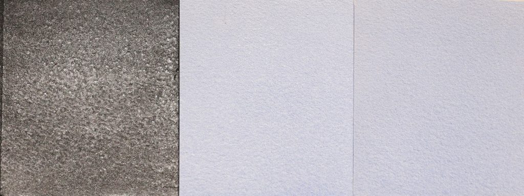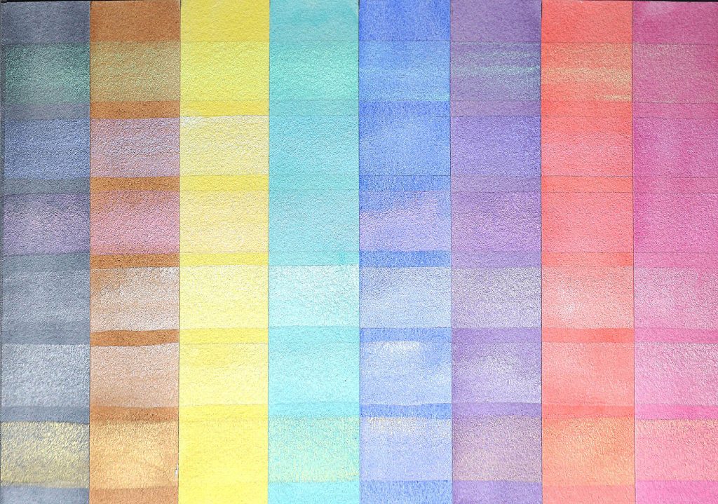 QoR Interference and Iridescent paints use pigments formed by coating mica flakes with Titanium Dioxide. Iridescent Gold is an exception, and has both an iron oxide pigment and Titanium Dioxide over the mica. Coating the thin, translucent, and reflective mica platelets with very thin layers of pigment creates a situation where light reflects and refracts between the microscopic layers. The thickness of the pigment layers, the nature of the pigments used, and the interaction with light results in the different colors and effects we see. Other than the coatings on the mica, there are no pigments in these paints. Their reflective nature means the Iridescent and Interference paints cannot be read in a spectrophotometer. Because of this, they have a lightfast ratings of “NA”. All six of these watercolors granulate.