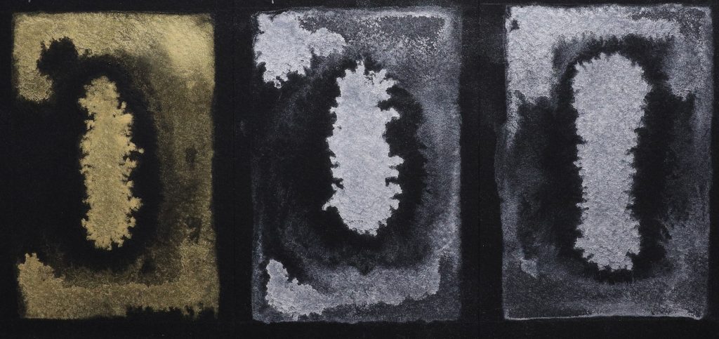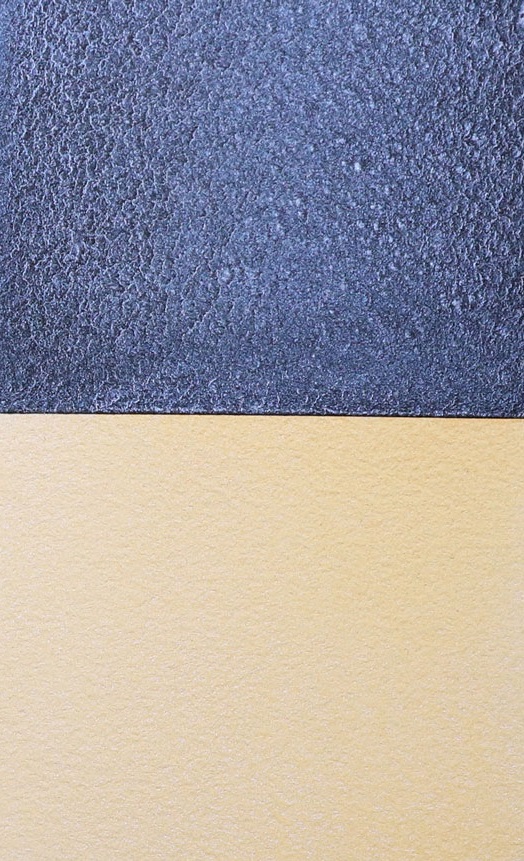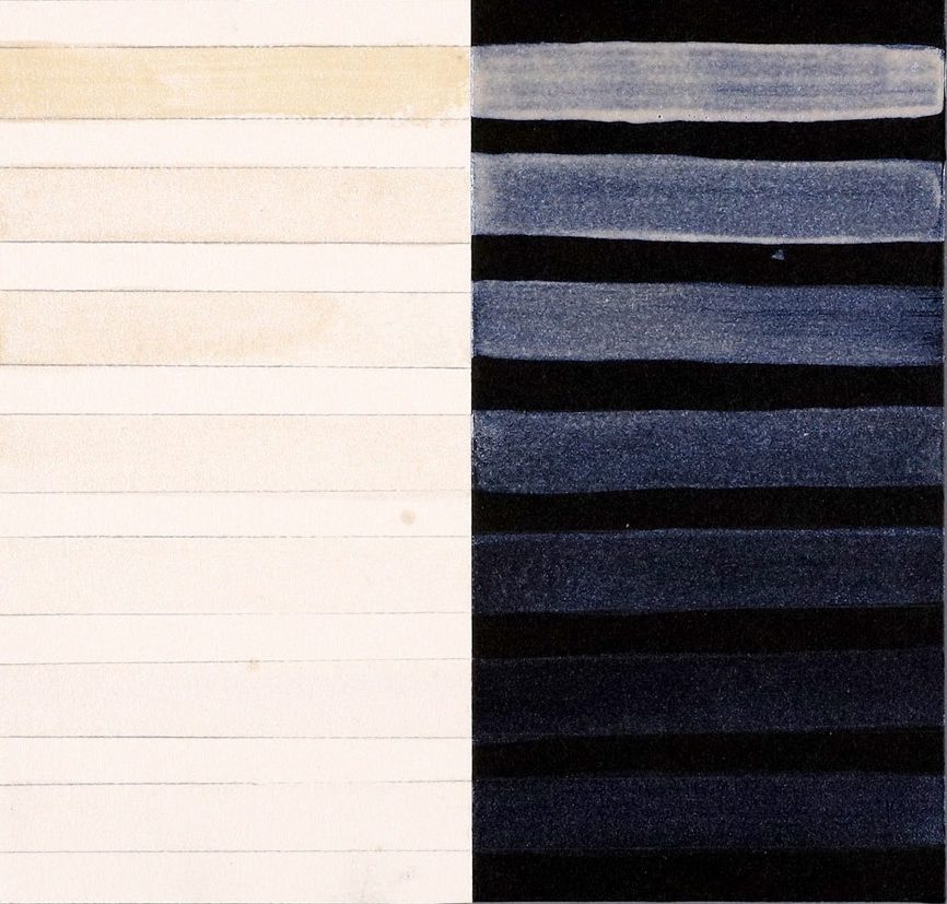 One beautiful aspect of the Interference paints is the mutability of what is seen, or available to be seen, in a single painting. A viewer’s perception of reflective shimmer and color in a single painting can change depending upon lighting and point of view. The possibilities expand further when an Interference paint is combined with non-Interference paints. On black paper, the Interference paint tends to dominate while against a lighter background, the non-Interference color might easily take charge (Image 4). Mixing with complements may emphasize color variance in what a viewer sees, while additions of the same or analogous colors create more subtle differences. When an interference paint dominates in a wash, that paint’s mutable reflective color shimmers against the stable background of the added color. When the non-interference paint prevails, the result may be a field of translucent color with a glistening reflective veil that appears and disappears as the lighting or view point shift.