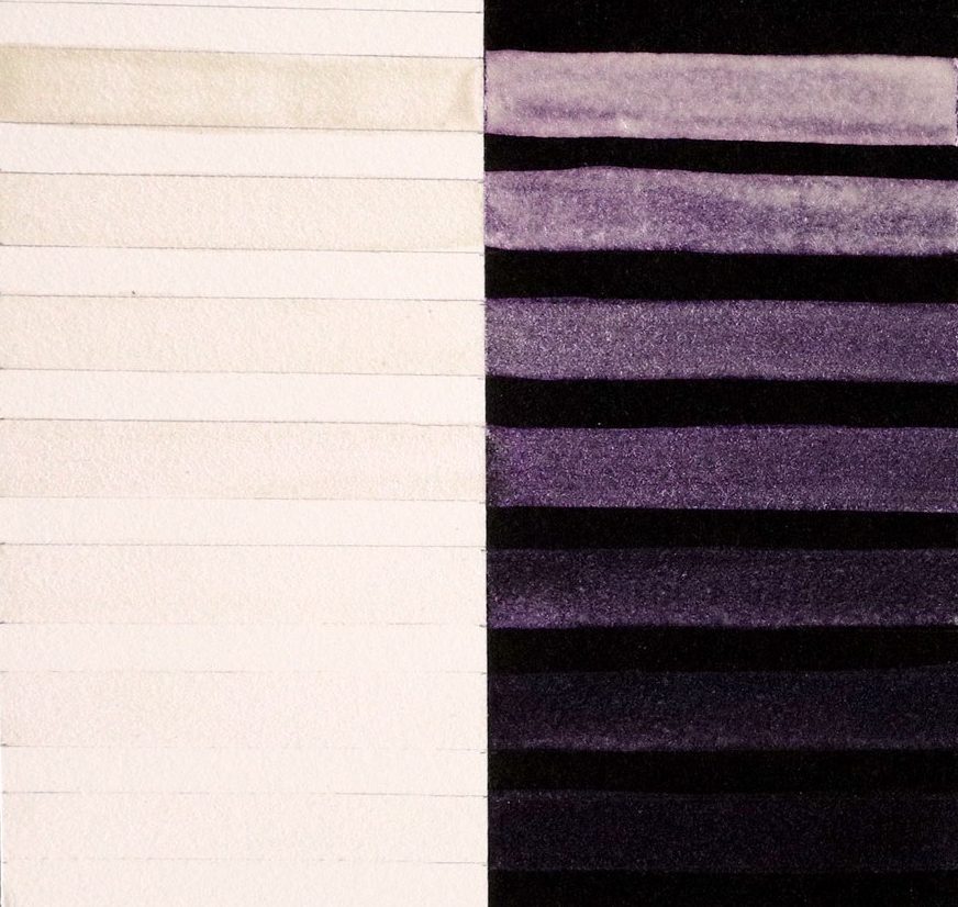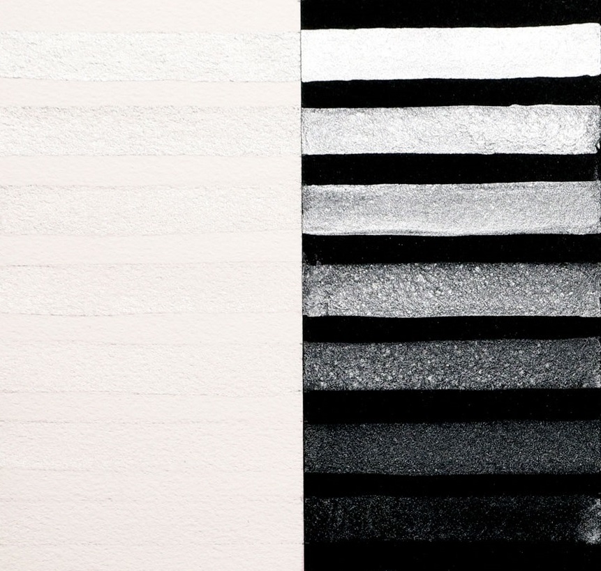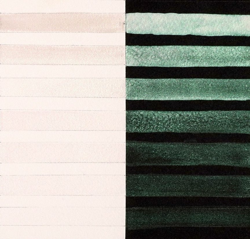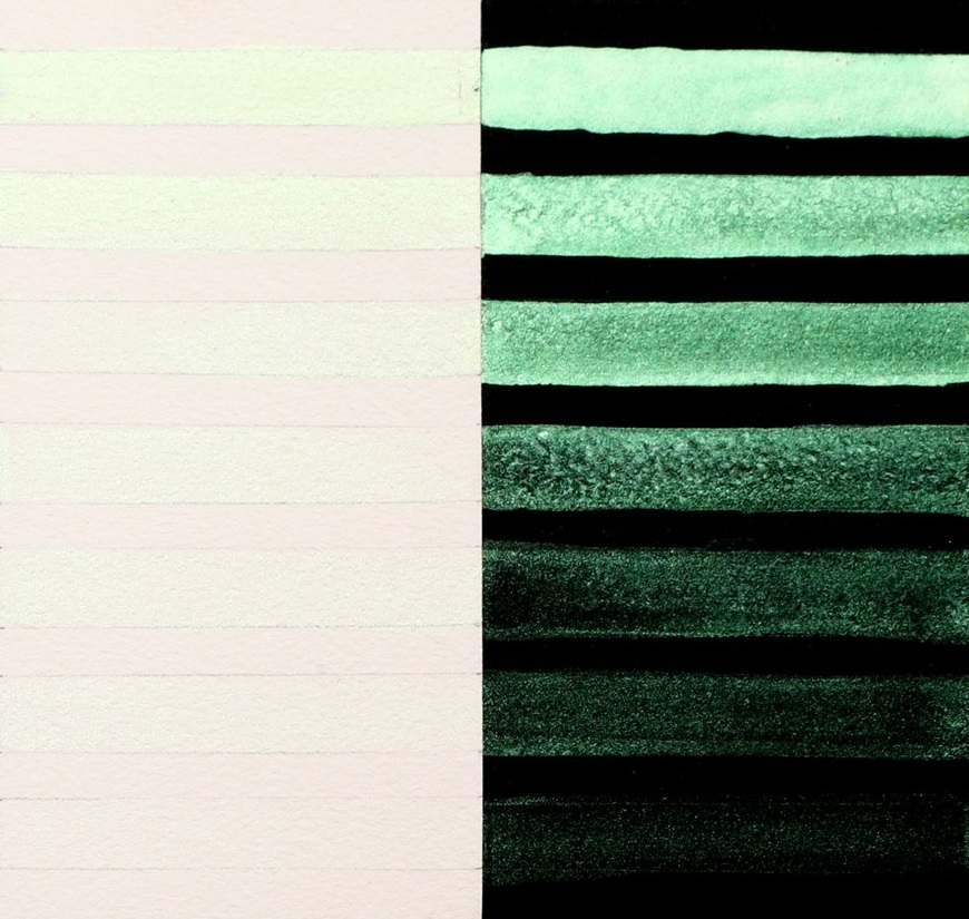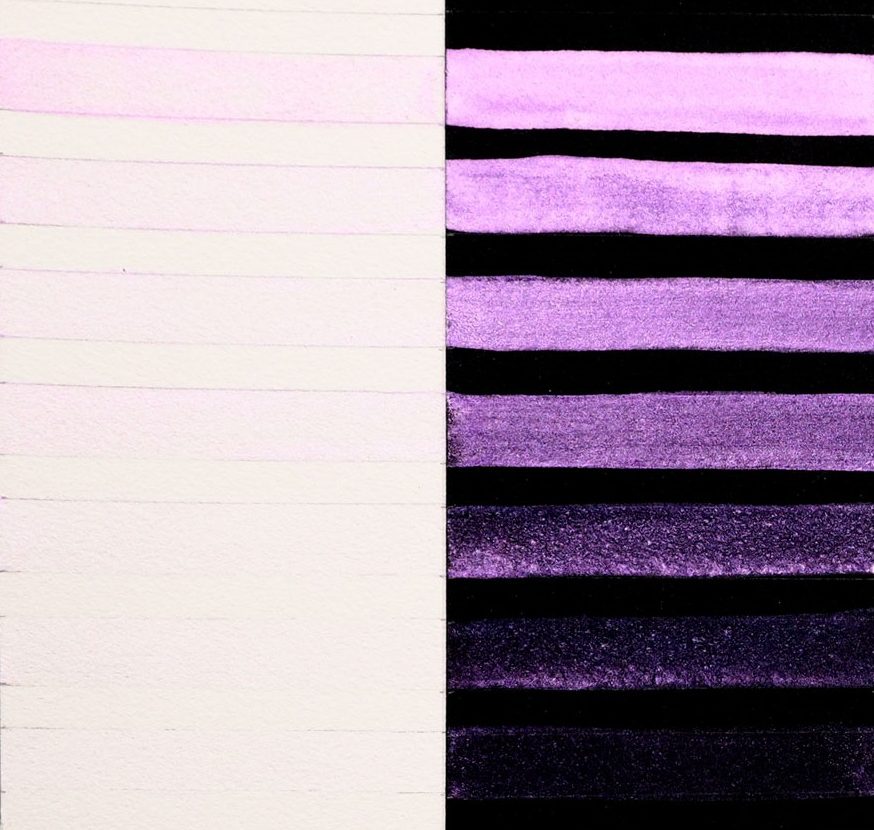 Interference paints visually sing when used in a transparent manner, and their colors shift depending upon the viewing angle and lighting (Image 2). The same diluted wash on top of black or white will appear totally different. Over white paper, Interference washes are more subtle and have a tendency to flash the complementary color. Over black paper, these are strong and vibrantly colorful paints with an unapologetic shimmer. Interference watercolors are most beautiful when used thinly as a glaze or wash. Thickly applied in masstone, the Interference paints may appear whitish and opaque.