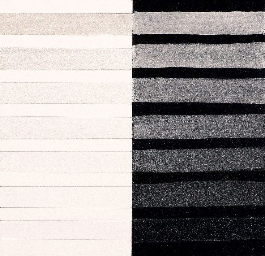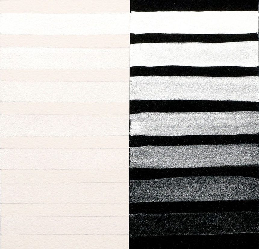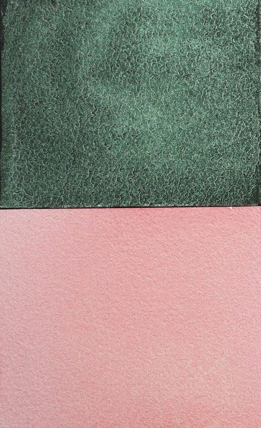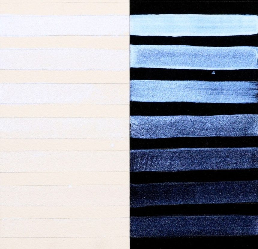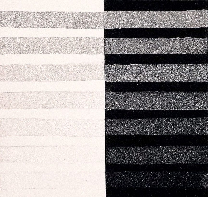 Interference paints visually sing when used in a transparent manner, and their colors shift depending upon the viewing angle and lighting (Image 2). The same diluted wash on top of black or white will appear totally different. Over white paper, Interference washes are more subtle and have a tendency to flash the complementary color. Over black paper, these are strong and vibrantly colorful paints with an unapologetic shimmer. Interference watercolors are most beautiful when used thinly as a glaze or wash. Thickly applied in masstone, the Interference paints may appear whitish and opaque.