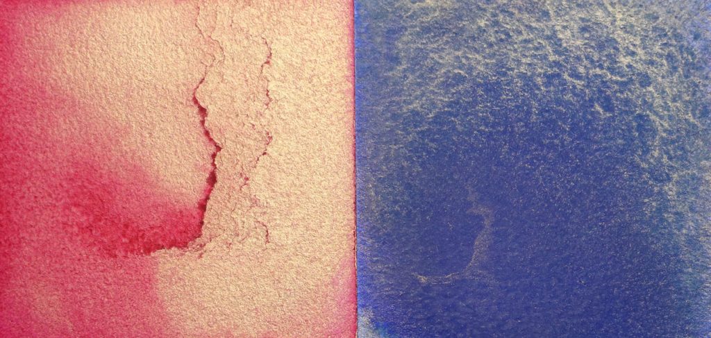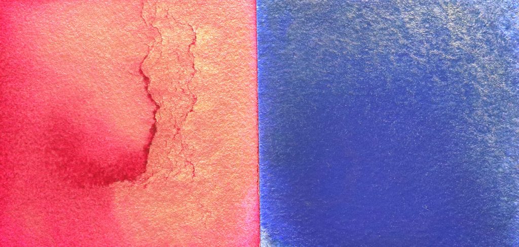 When puddles of diluted mixed paint are poured on watercolor paper, the Iridescent or Interference can separate out from other pigments. The examples in Image 5 show a mix of Iridescent Gold with Quinacridone Magenta and with Ultramarine Blue. Perhaps because the Ultramarine granulates, its gold partner appears in scales and wisps rather than as a mostly solid mass.