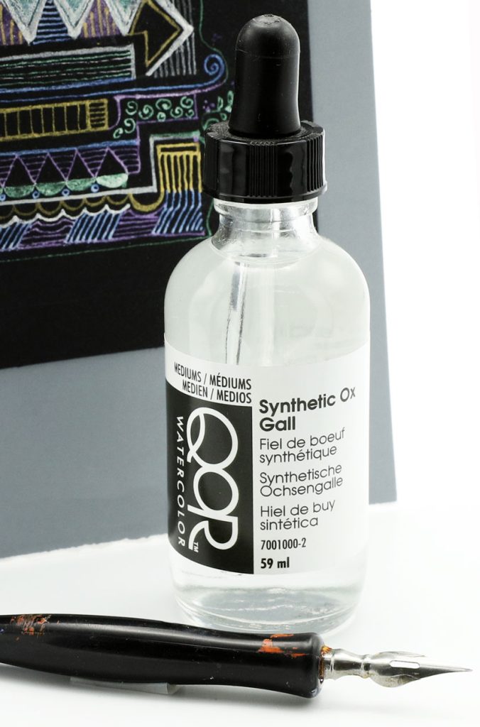 A simple dip pen with a replaceable nib works as a calligraphic tool to draw and write with these paints (Image 8). We favor a pointed nib with a bowl, shaped like an upside-down water drop. We mixed the paint with water to the desired consistency and dilution, forming a puddle on the palette. We loaded the nib with a brush before applying practice lines to a scrap of the paper being used. When the paint is not flowing from the nib as desired, a tiny bit of Synthetic Ox Gall can be added to the mixture. The additive may be mixed into the water used to dilute the paint, or a drop of the additive can be placed on the palette and a brush used to lift a tiny bit of it to add to the diluted paint.