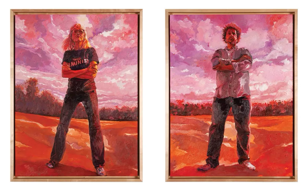 (L) Carol #jesusandjohnwayne, 24'' x 18'', Oil on aluminum, 2023, (R) Jamele, #artthenewreligion, 24'' x 18'', Oil on aluminum, 2023